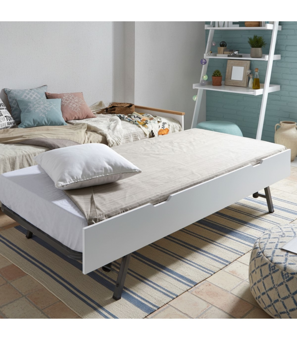 Ausziehbett mit Beine und Lattenrost 90x190cm mit Metallrahmen. Es handelt sich um ein ausziehbares Zusatzbett, das entweder auf dem Boden steht oder wie auf dem Foto zu sehen ist, erhöht werden kann. Die Schubladenfront ist aus MDF, weiß lackiert, weiß gewaschen oder Kiefer.