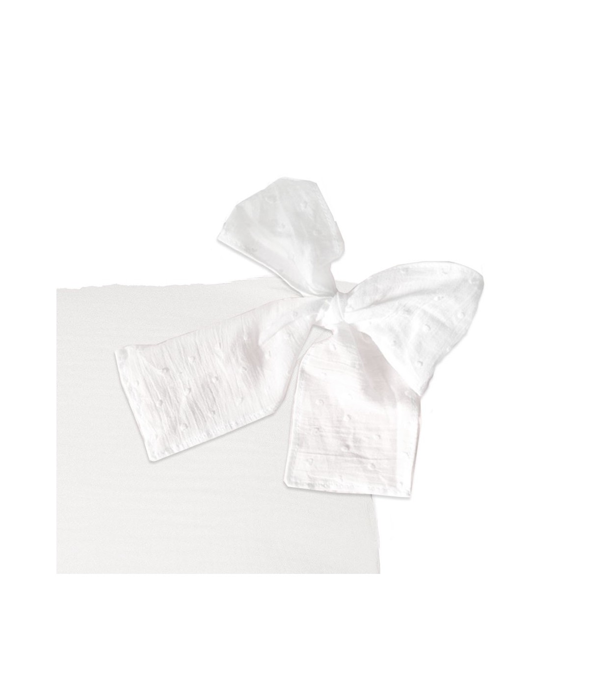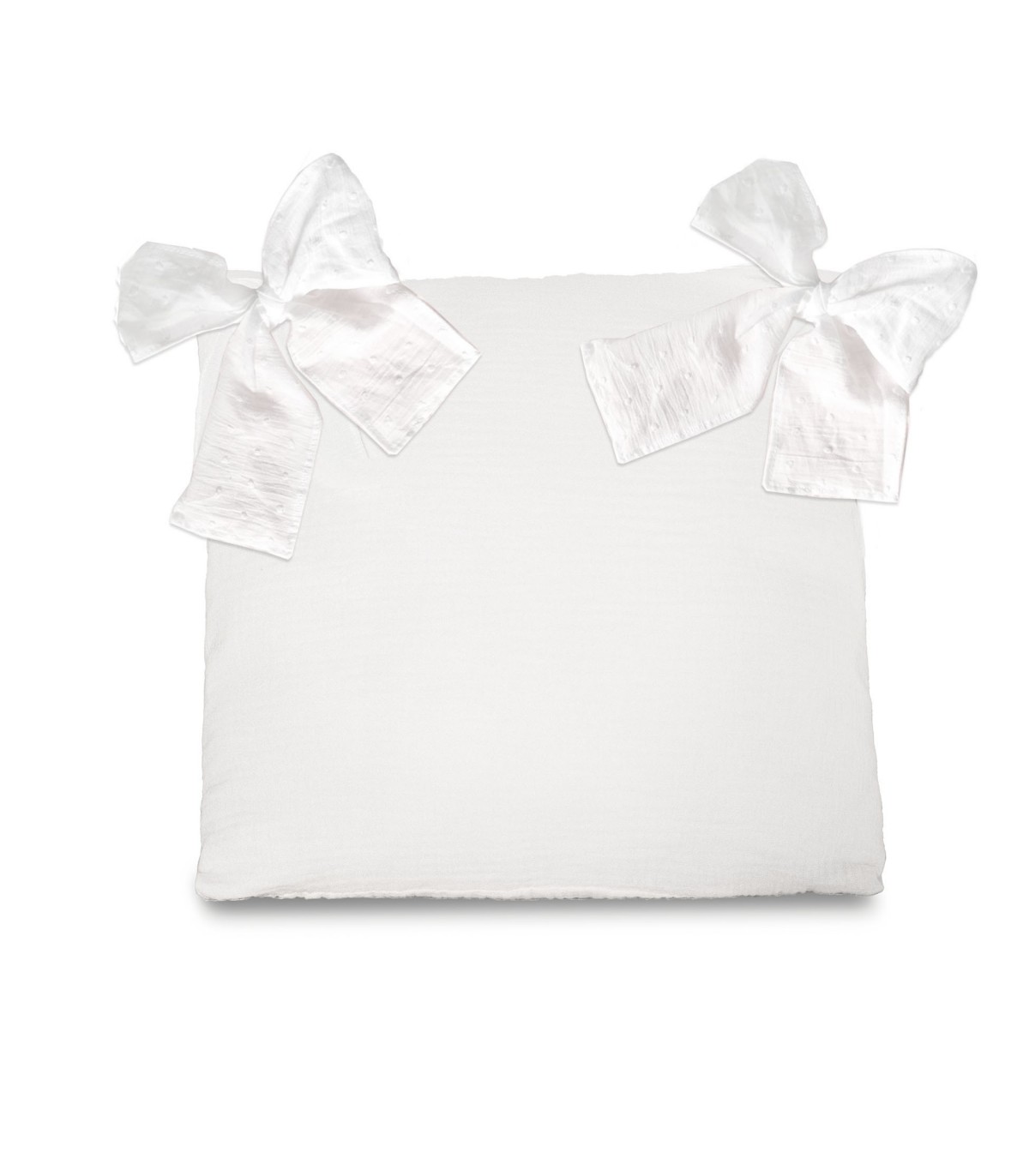 Kissenbezug 40x40 aus 100% Baumwollmusselin. Und Schleifen aus Plumeti, ebenfalls 100% Baumwolle.