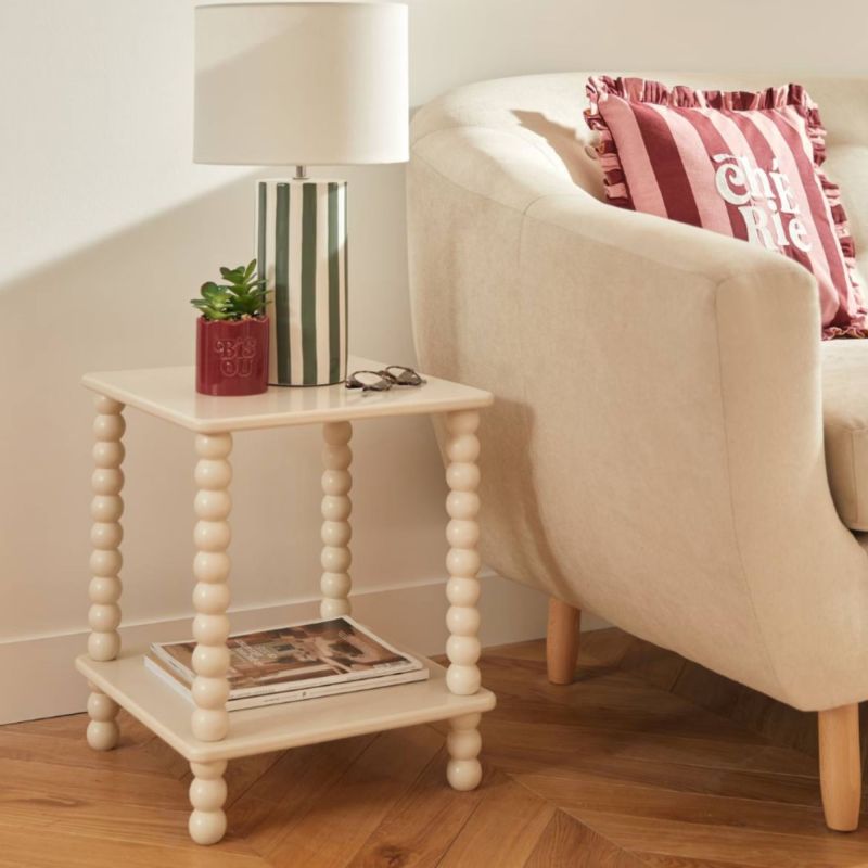 Verleihen Sie jedem Raum mit diesem einzigartigen Beistelltisch eine bezaubernde und originelle Note. Sein vielseitiges Design macht ihn zum perfekten Begleiter, sowohl um ein Kinderzimmer zu beleben als auch um dem Wohnzimmer Stil zu verleihen. Er besticht durch sein praktisches Regal, ideal zum Organisieren von Büchern, Spielzeug oder kleinen Dekorationsgegenständen, sodass alles immer griffbereit ist. Was ihn wirklich besonders macht, sind seine Beine, die aus kreativen, übereinander geschichteten Kugeln bestehen und dem Tisch gleichzeitig einen einzigartigen und raffinierten Look verleihen. Dieser Tisch ist nicht nur funktional, sondern auch ein dekoratives Element, das die Fantasie anregt und jede Ecke in einen gemütlichen Ort voller Persönlichkeit verwandelt. Perfekt für alle, die das besondere Detail suchen, das ihr Zuhause einzigartig macht.