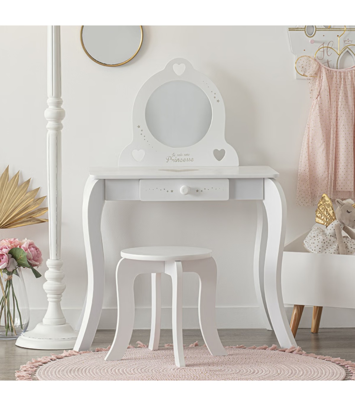 Für die Prinzessin des Hauses haben wir ein wunderschönes Kommoden- und Hockerset für stundenlanges Spiel und Unterhaltung. Sein Design ist perfekt für den täglichen Gebrauch durch Kinder geeignet, er hat eine abgerundete Oberfläche für die Sicherheit der Kinder.