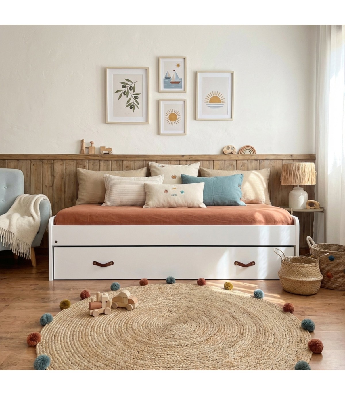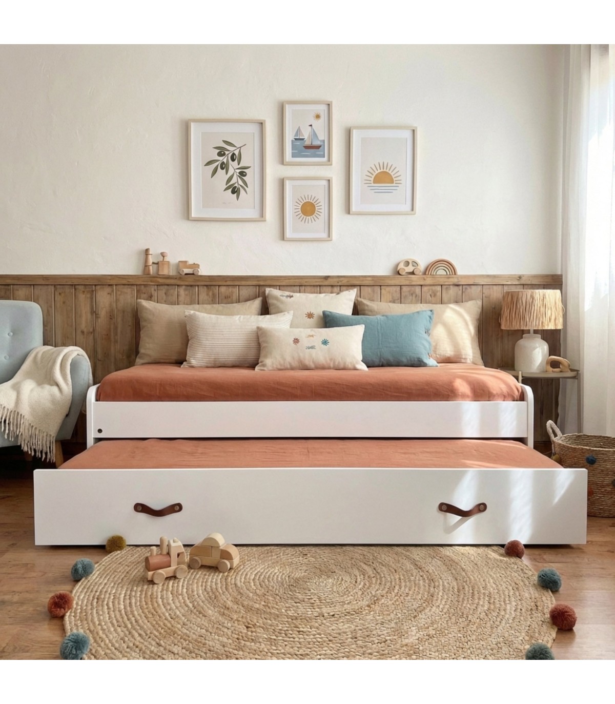 La cama nido con elevable Luca es super funcional, 2 camas cómodas en el espacio de una. Con bordes redondeados para evitar accidentes. La cama inferior es un somier de 90 cm con patas que se despliegan quedando elevada. Todo en blanco para que encaje en cualquier espacio.
