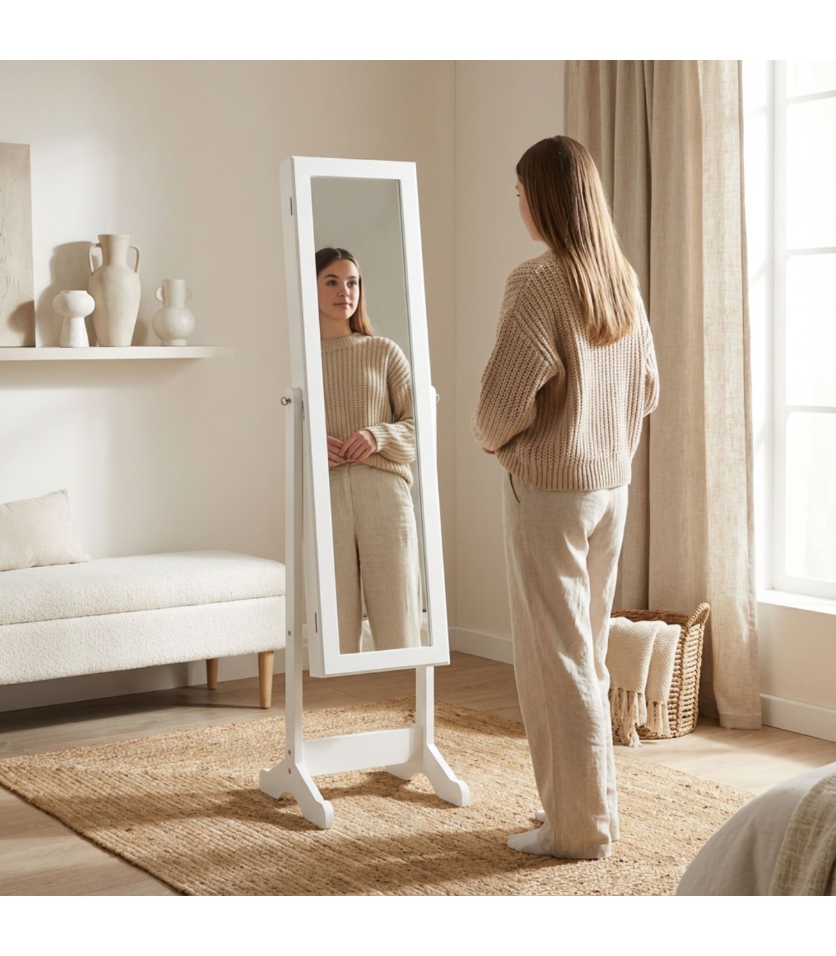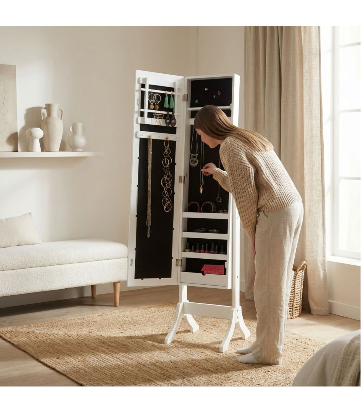 Fantástico espejo joyero de pie en el que por fin podrás mantener todas tus joyas y accesorios de maquillaje ordenados en un mismo lugar. El espejo es inclinable lo que te permitirá colocarlo de la manera que te sea más cómoda. Este mueble dispone de varios estantes y colgadores en su interior para que puedas clasificar tus objetos personales como más te guste. El interior está forrado con una tela sintética. Te vas a enamorar de él!