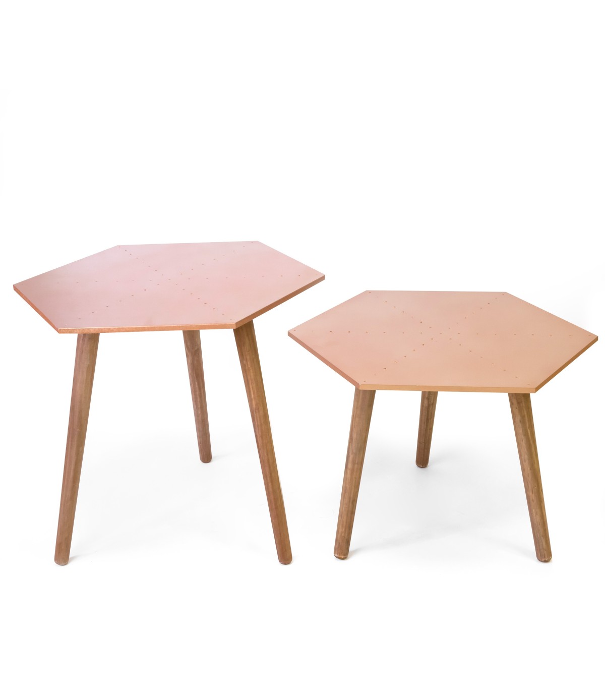 Conjunto de 2 mesas auxiliares hexagonales. Tienen un diseño de estilo nórdico y chic muy llamativo. Se presentan en dos alturas diferentes, para poder guardar una mesita debajo de la otra. También las puedes usar por separado, para crear diferentes espacios en los que la estética escandinava prime por encima de todo.