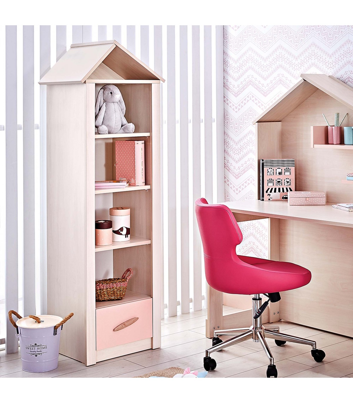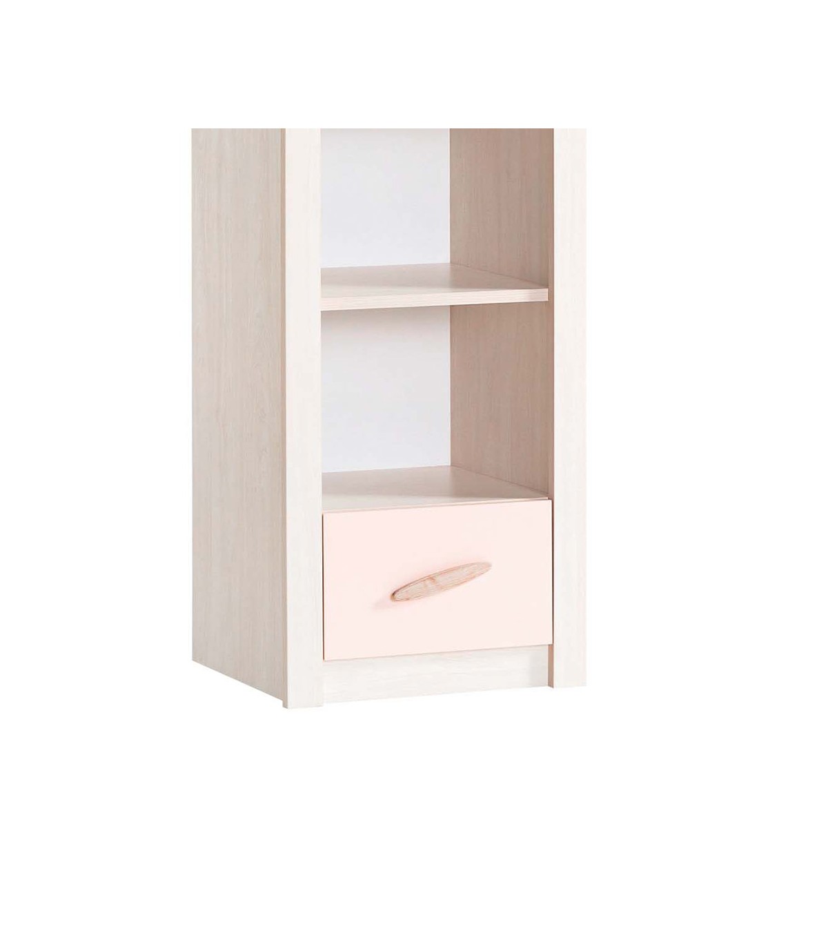 Iris shelf in pink colour, perfect to combine with the Iris collection by MueMue. The shelf includes 4 pull-out shelves and a drawer. It is ideal for enhancing the storage options in children's bedrooms.