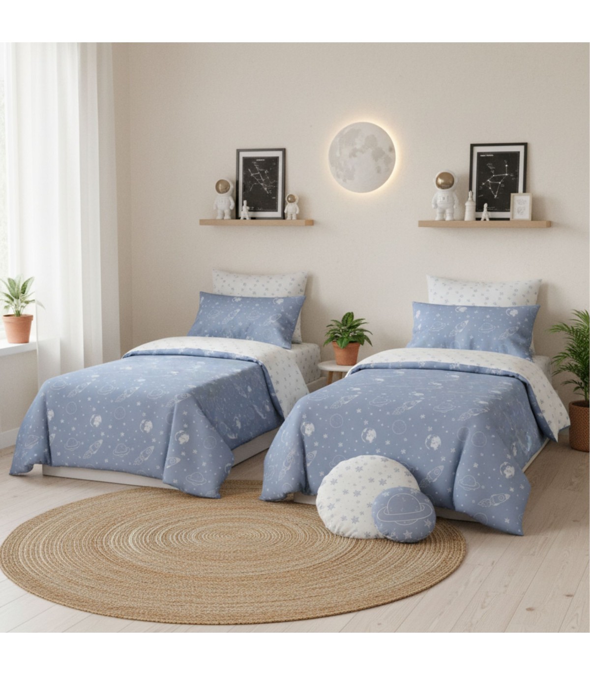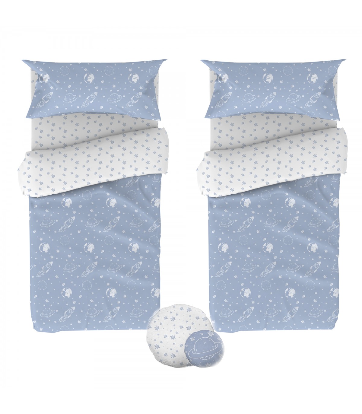Include 2 copripiumino nordico, 2 lenzuola con angoli, 2 federe e 1 pack di 2 cuscini.