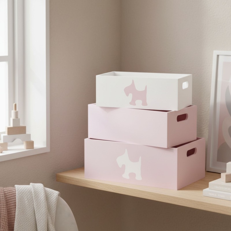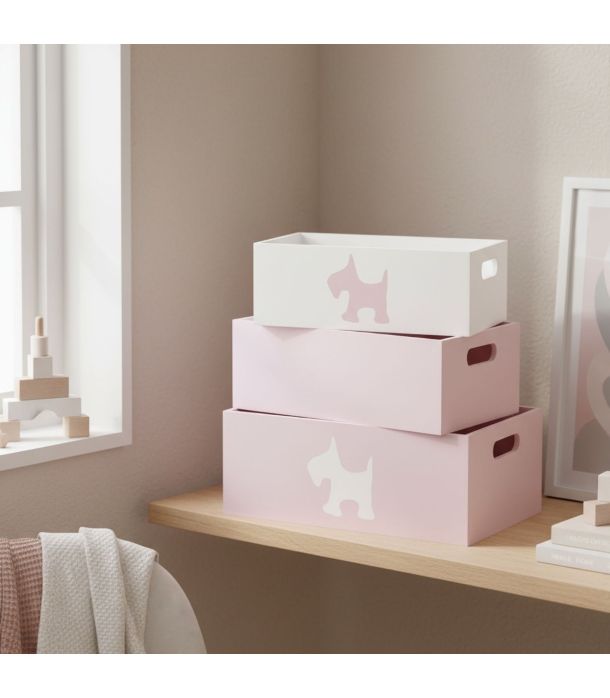 Ognuna delle scatole è dotata di piccole maniglie, che facilitano il trasporto. Sono realizzati in MDF in fibra di legno di alta qualità e sono laccati in tonalità pastello, ideali per gli ambienti dei più piccoli. Queste scatole decorative includono l'immagine di un cane molto particolare.