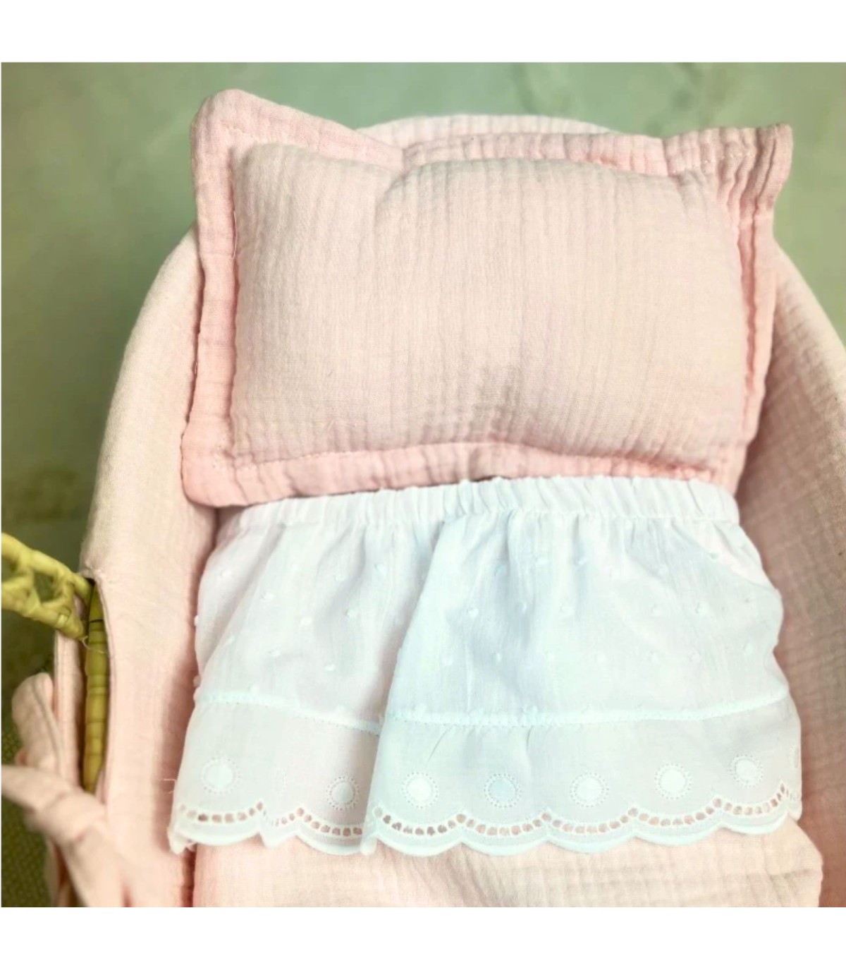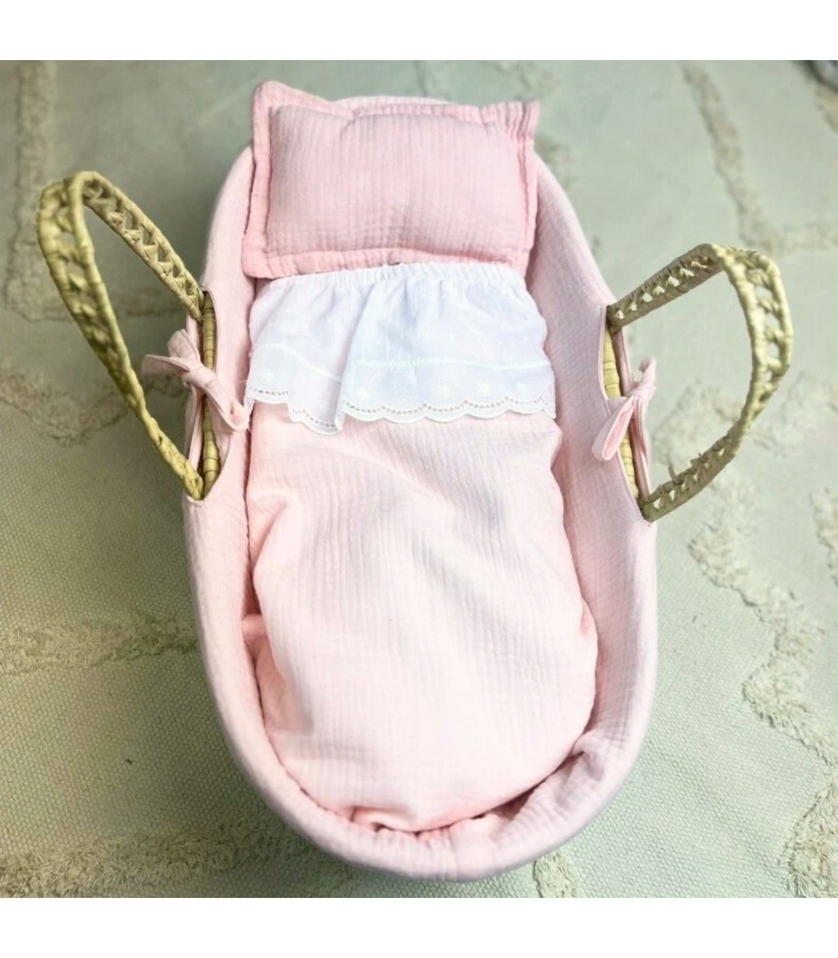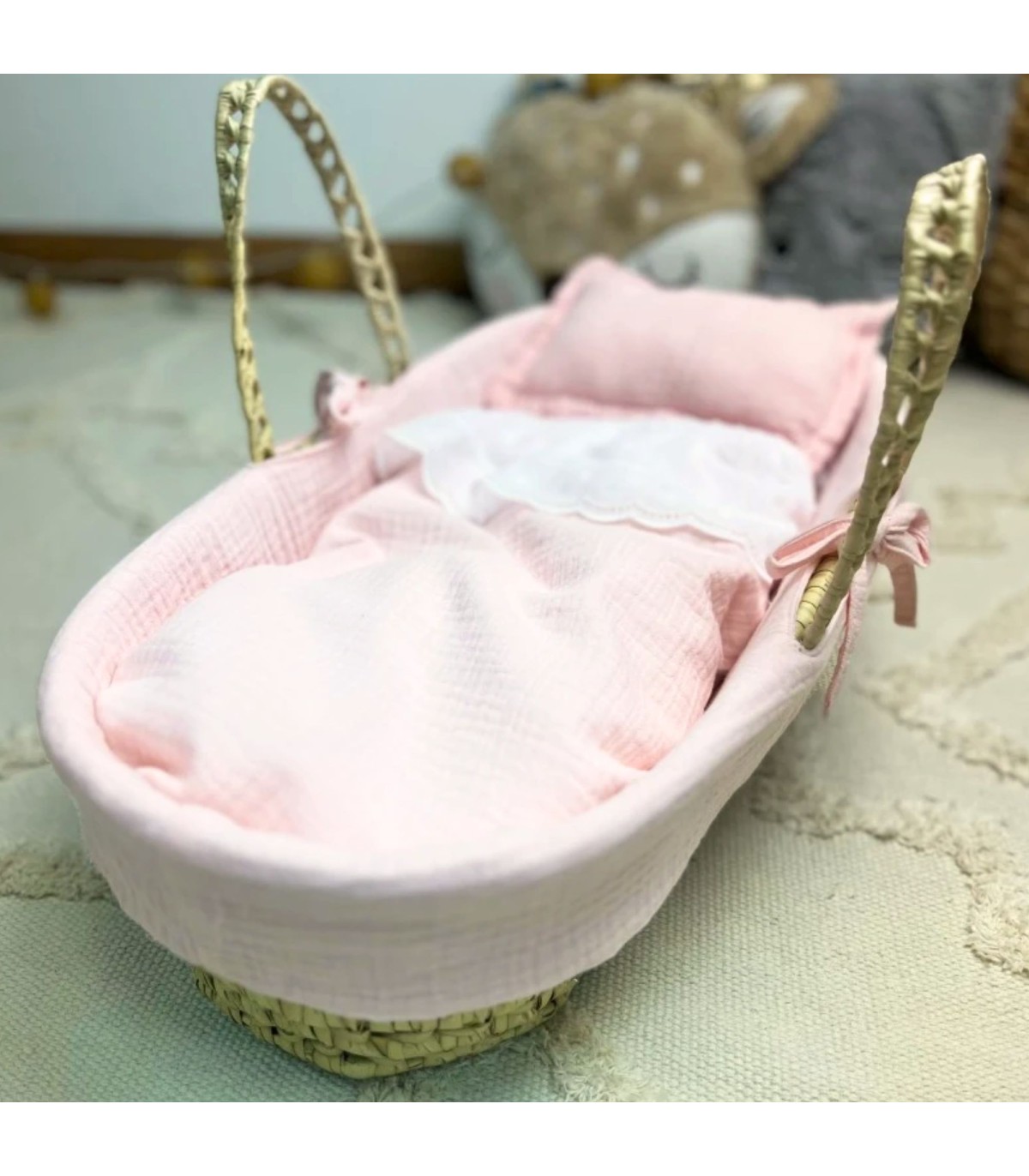 Os seus filhos adoram brincar com bonecas, por isso serão os melhores pais de sempre! Este cesto é o tamanho perfeito para um boneco renascido, é quase do tamanho de um boneco bebé! Vem totalmente equipada, com uma almofada de plumeti, um cobertor forrado no interior, com um folho de plumeti e uma bonita renda.