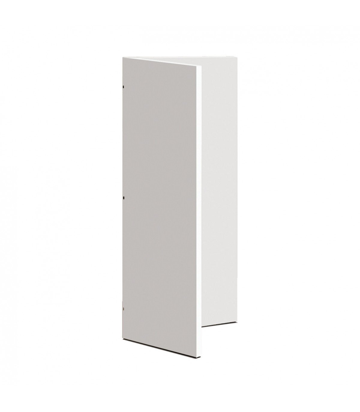 E uma perna em forma de L. O suporte é em aço pintado de cinzento e o resto em aglomerado de melamina.