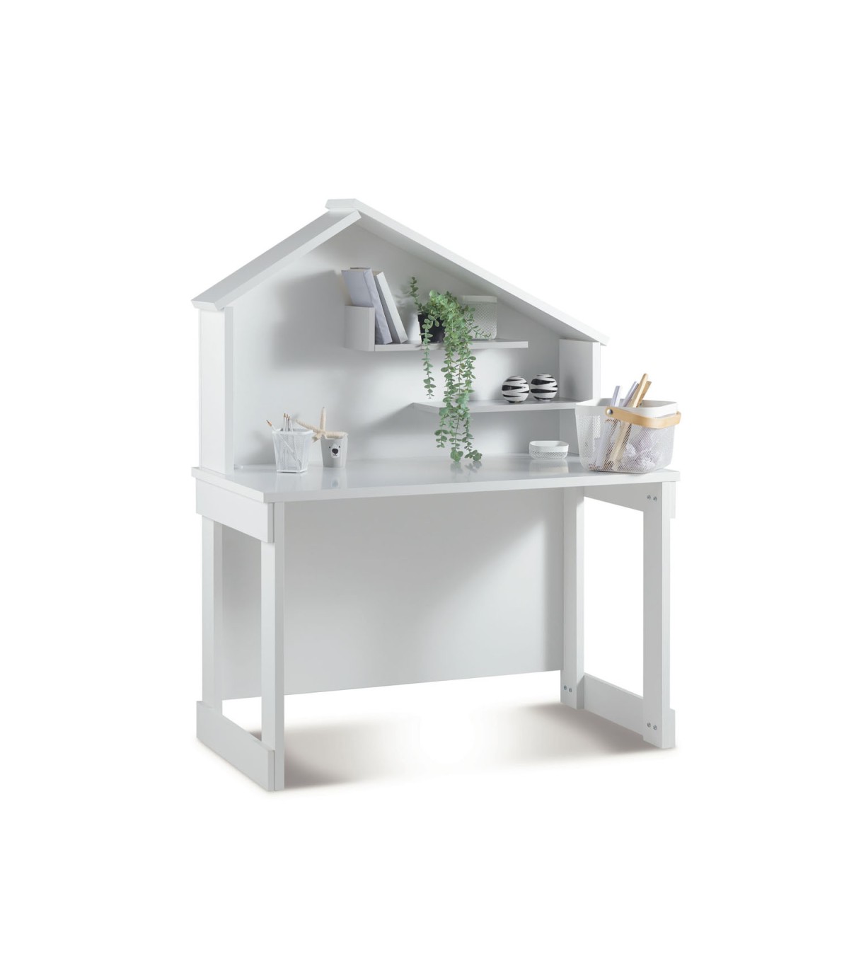 A secretária Iris é ideal para dar um toque diferente ao quarto das crianças. Esta secretária para trabalhos de casa ou trabalhos manuais será perfeita para decorar o espaço dedicado ao trabalho das crianças. As prateleiras permitem-lhes ter tudo à vista. A secretária tem uma estrutura em forma de casa muito original e divertida.