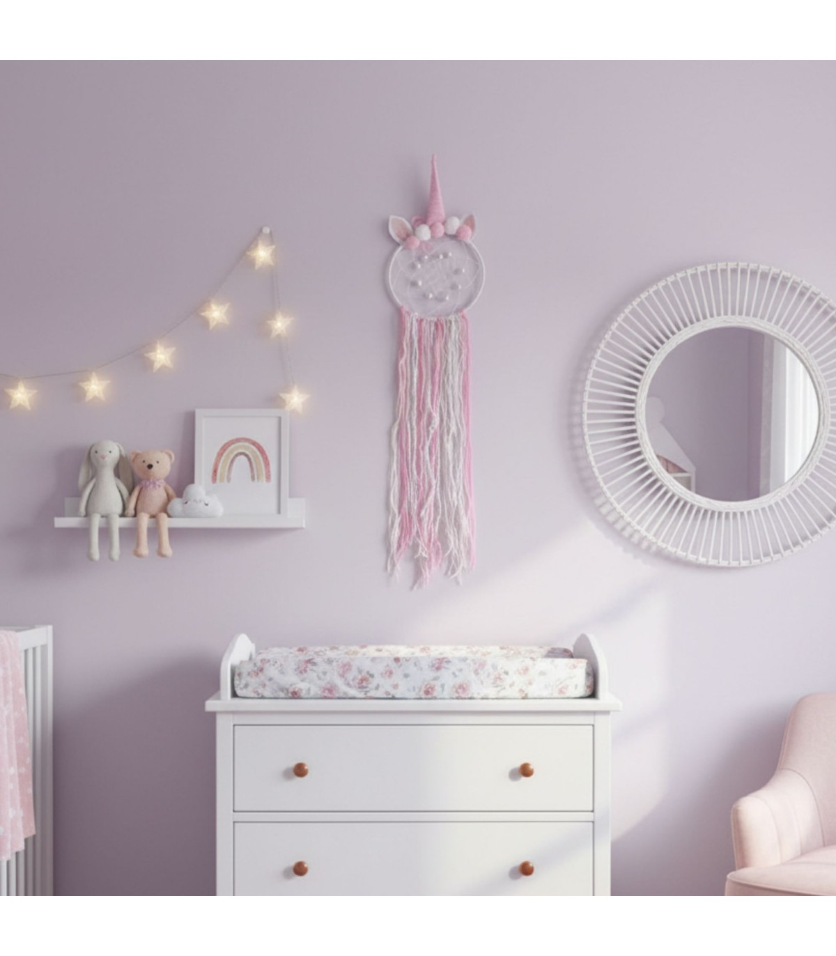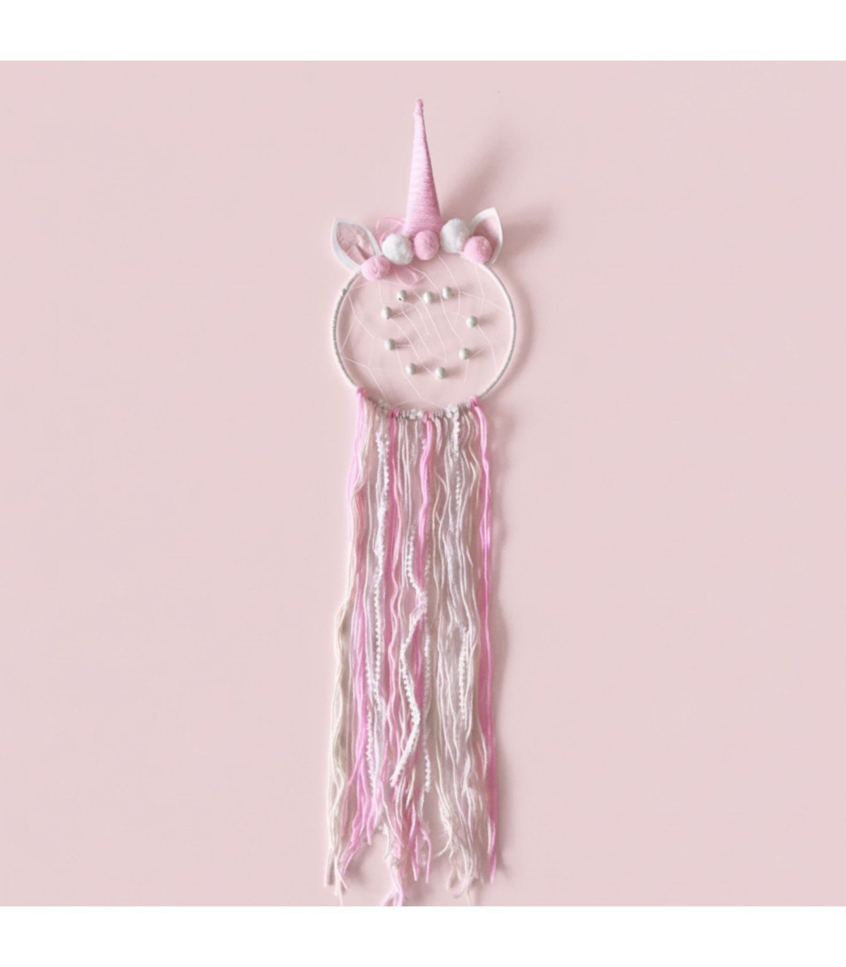 Apanhador de sonhos de unicórnio, muito decorativo para o quarto das crianças. Diz-se que os apanhadores de sonhos são amuletos que lhe permitem filtrar os sonhos negativos e deixar passar apenas os bons.